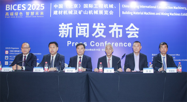 2024年8月19日,中国(北京)国际工程机械、建材机械及矿山机械展览会(以下简称BICES 2025)新闻发布会在北京隆重召开。中国工程机械工业协会(以下简称协会)会长苏子孟,协会名誉会长兼特别顾问祁俊,中国国际贸易促进委员会机械行业分会会长周卫东,协会秘书长兼北京天施华工国际会展有限公司(以下简称会展公司)董事长吴培国,协会副会长、双碳工作委员会会长、双碳标委会执行主任委员李建友,中工工程机械成套有限公司总经理、协会中小企业服务工作委员会秘书长李劲,中国液压气动密封件工业协会副理事长刘伟林,以及展商单位代表、用户相关单位代表中国中铁、中国路桥、中石化起运、北京建工、矿冶科技集团、中国化工建设企业协会、中国电力建设企业协会、中国冶金建设协会吊装委、交科院交委会等代表出席了发布会。发布会由周卫东主持。